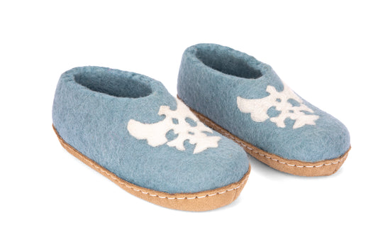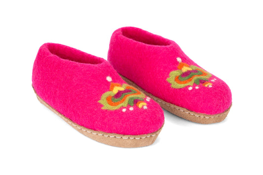 Håndtovede barnetøfler i 100 % ren, ny ull fra New Zealand – samme høye kvalitet som våre voksentøfler. Ullen farges med AZO-frie fargestoffer før tøflene håndlages i Nepal. Semsket kuskinn-såle gir en komfortabel innesko.