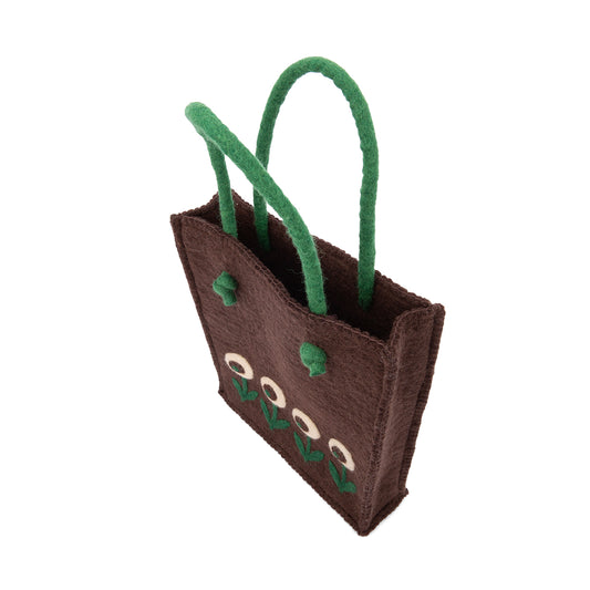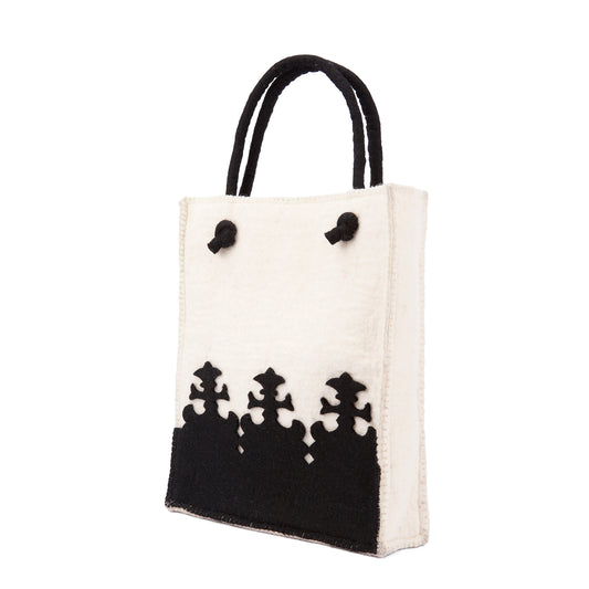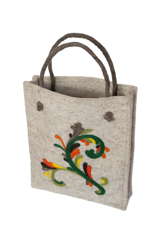 Veskene er håndlaget av kvinner i Kathmandu. Materialet er 100% ren ny ull fra New Zealand. Veskene er tovet og mønsteret lages ved hjelp av teknikken nålefilting.