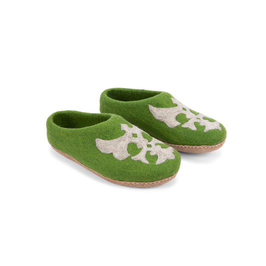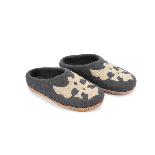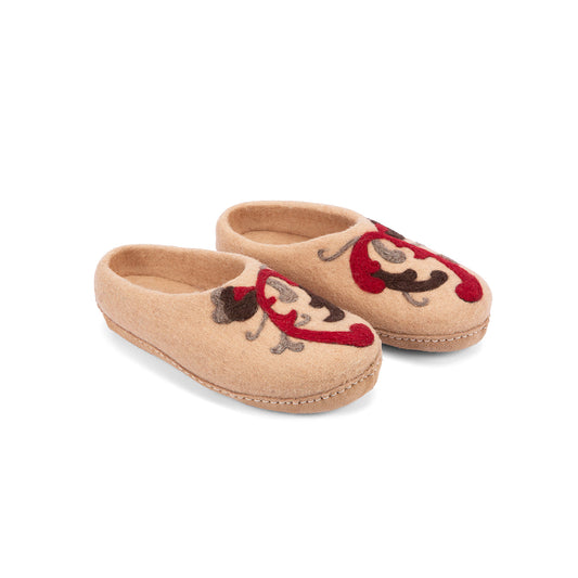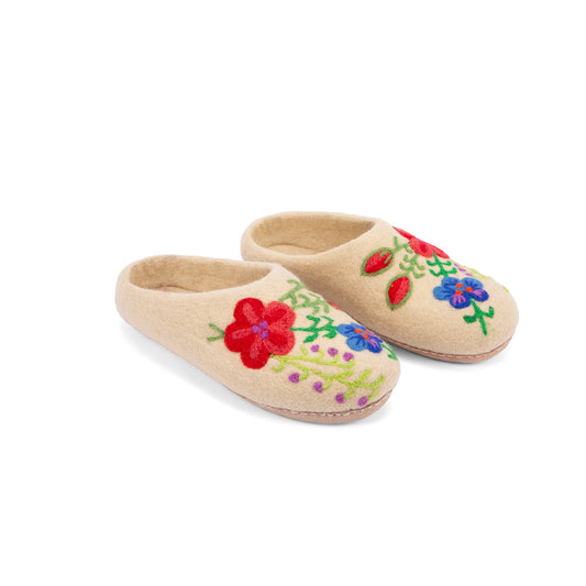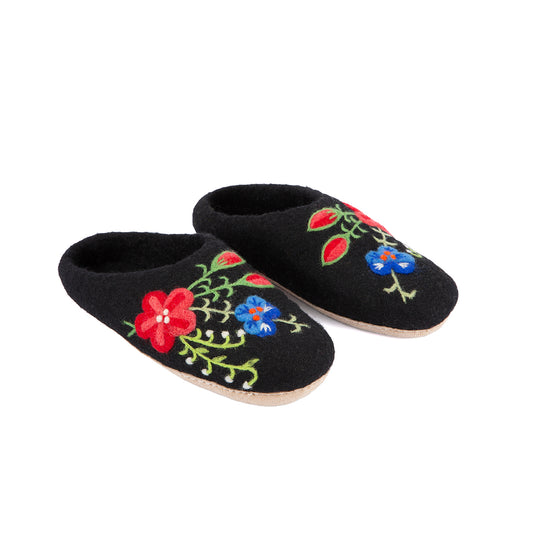 Tøflene produseres av flinke, flittige hender i Kathmandu. Det er kvinnene som tover ullen, former tøffelen og påfører mønsteret ved hjelp av nålefiltingsteknikk. Materialet er 100 % ren ny ull fra New Zealand med såle i semsket kuskinn.